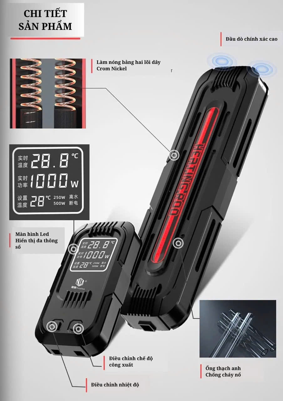 - SƯỞI BIẾN TẦNG THẠCH ANH LÕI KÉP ROYAL FISH R-913.Thanh sưởi đôi kéo nhiệt nhanh, ổn định nhiệt độ,có thể sử dụng ở cả hai công suất - Dễ dàng cài đặt nhiệt độ và theo dõi nhiệt độ với bảng điều khiển hiển thị Led bên ngoài